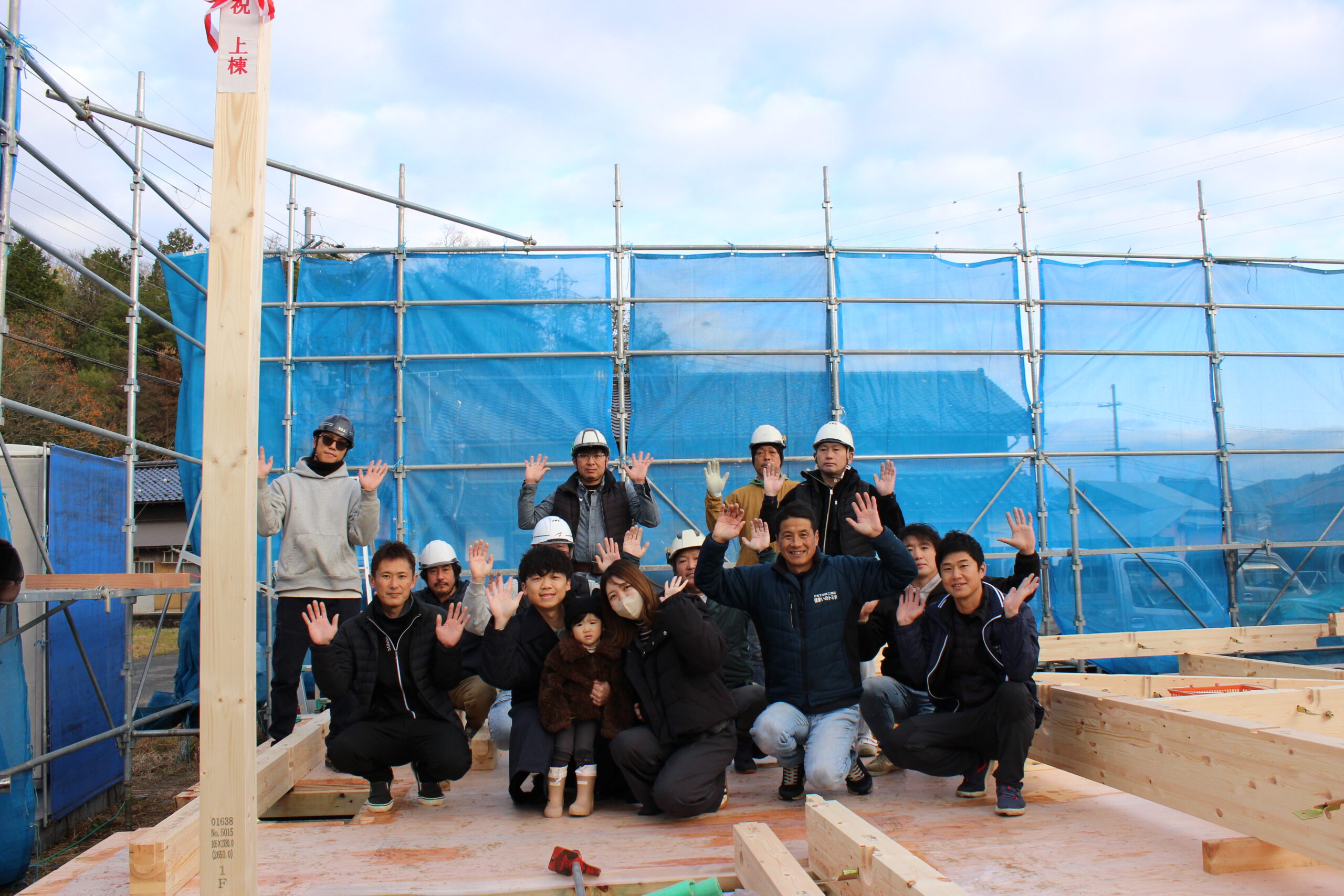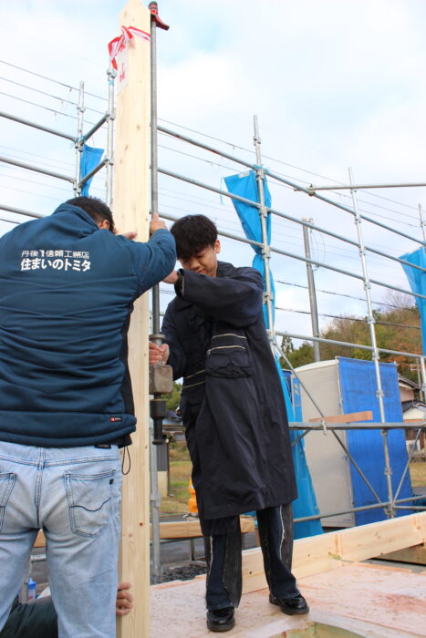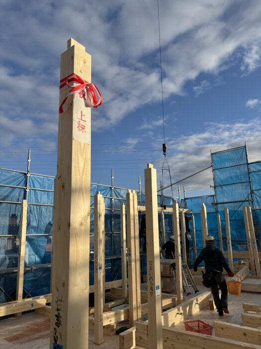 最初に施主様による 一本柱を建ててもらい 上棟がスタートします